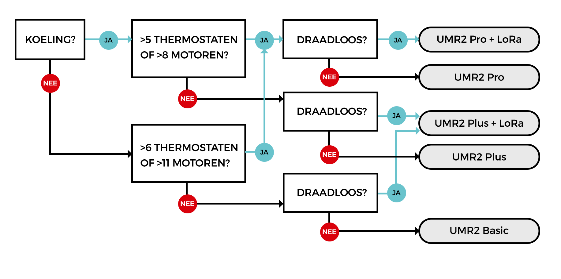 De UMR2 is beschikbaar in 3 uitvoeringen: UMR2 Basic, UMR2 Plus en UMR2 Pro. Afhankelijk van de specifieke kenmerken van de installatie selecteer je het juiste type. Zo garanderen we voor elke installatie een passende regeling, zonder onnodige functies. Gebruik de beslisboom om vast te stellen welk type UMR2 je nodig hebt.